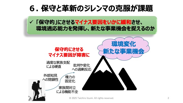 ファミリー企業における継続と革新の両立を、学術理論と実例から解説。保守的になりやすいファミリー企業が環境変化に適応し、長期的に成長するメカニズムを探る。本講演は、ファミリー企業が持つ特性(SEW)を理解し、適切なガバナンスによって環境適応能力(DC)を高め、永続的な成長を実現するためのメカニズムについて解説している。